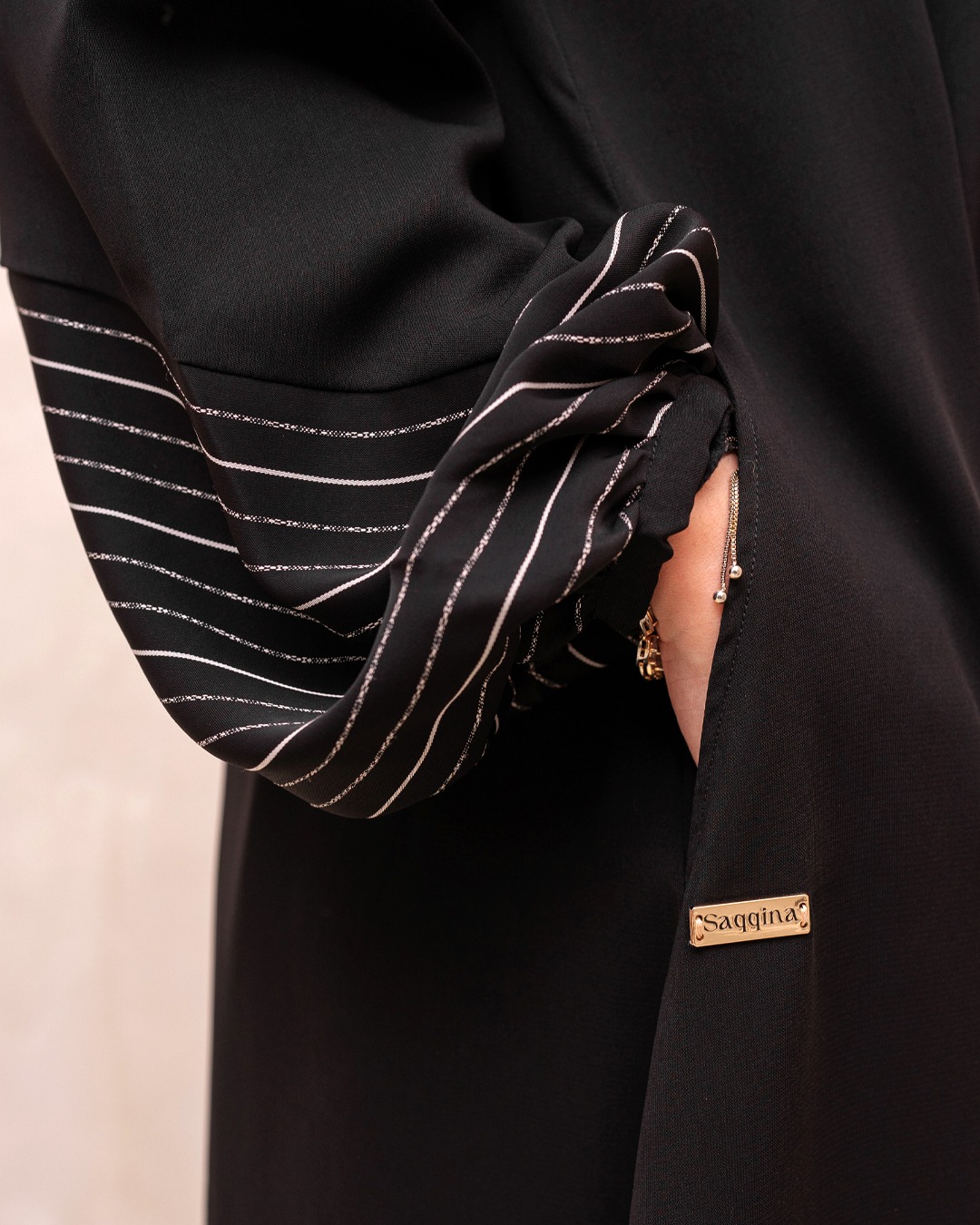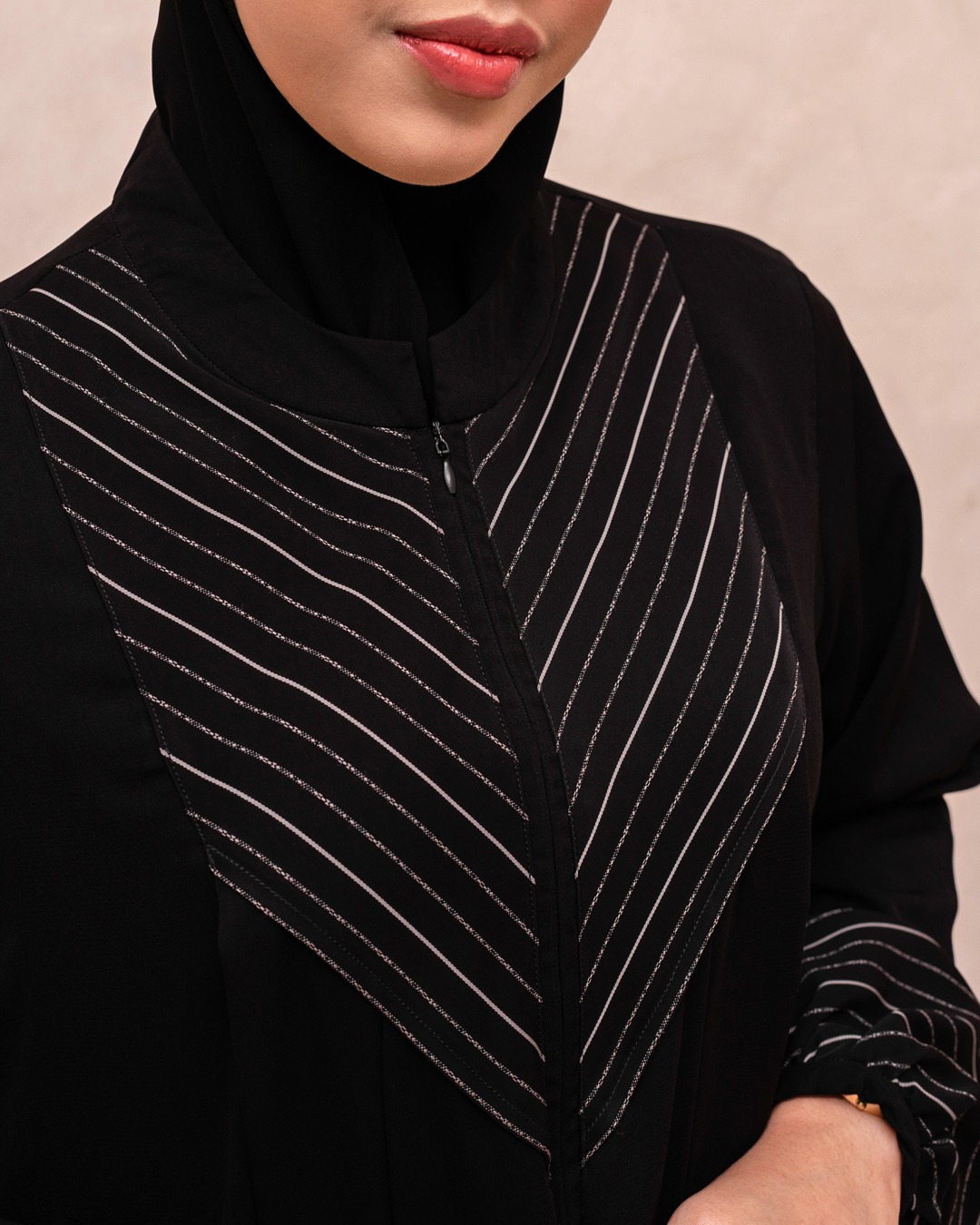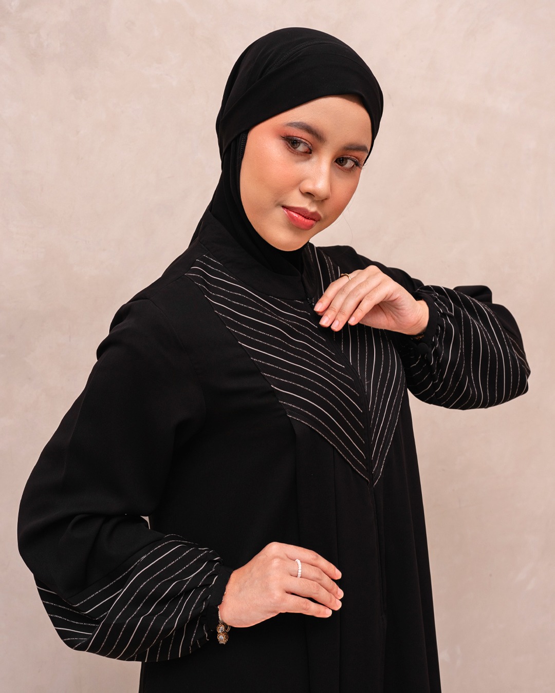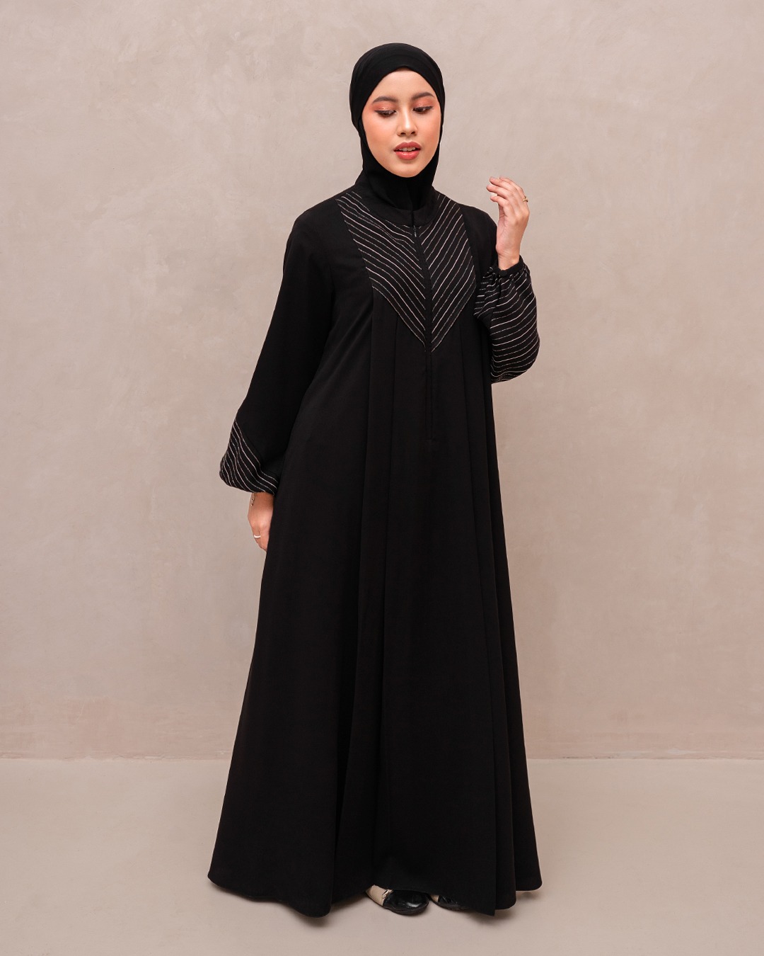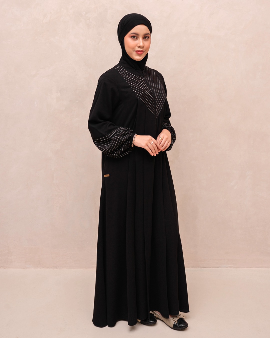 Gamis syar’i dengan detail lengan puff dan bordir cantik pada bagian dada serta lengan. Dilengkapi bukaan resleting depan yang praktis, menghadirkan tampilan mewah sekaligus feminin.