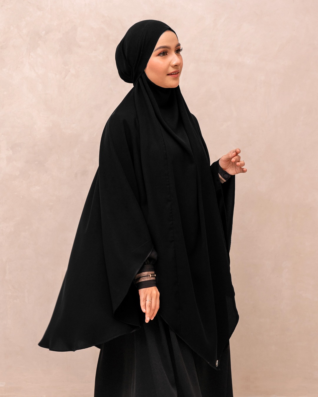 Khimar multifungsi dengan tiga gaya pemakaian, dilengkapi niqab lepas-pasang untuk tampilan yang praktis dan fleksibel di berbagai aktivitas.