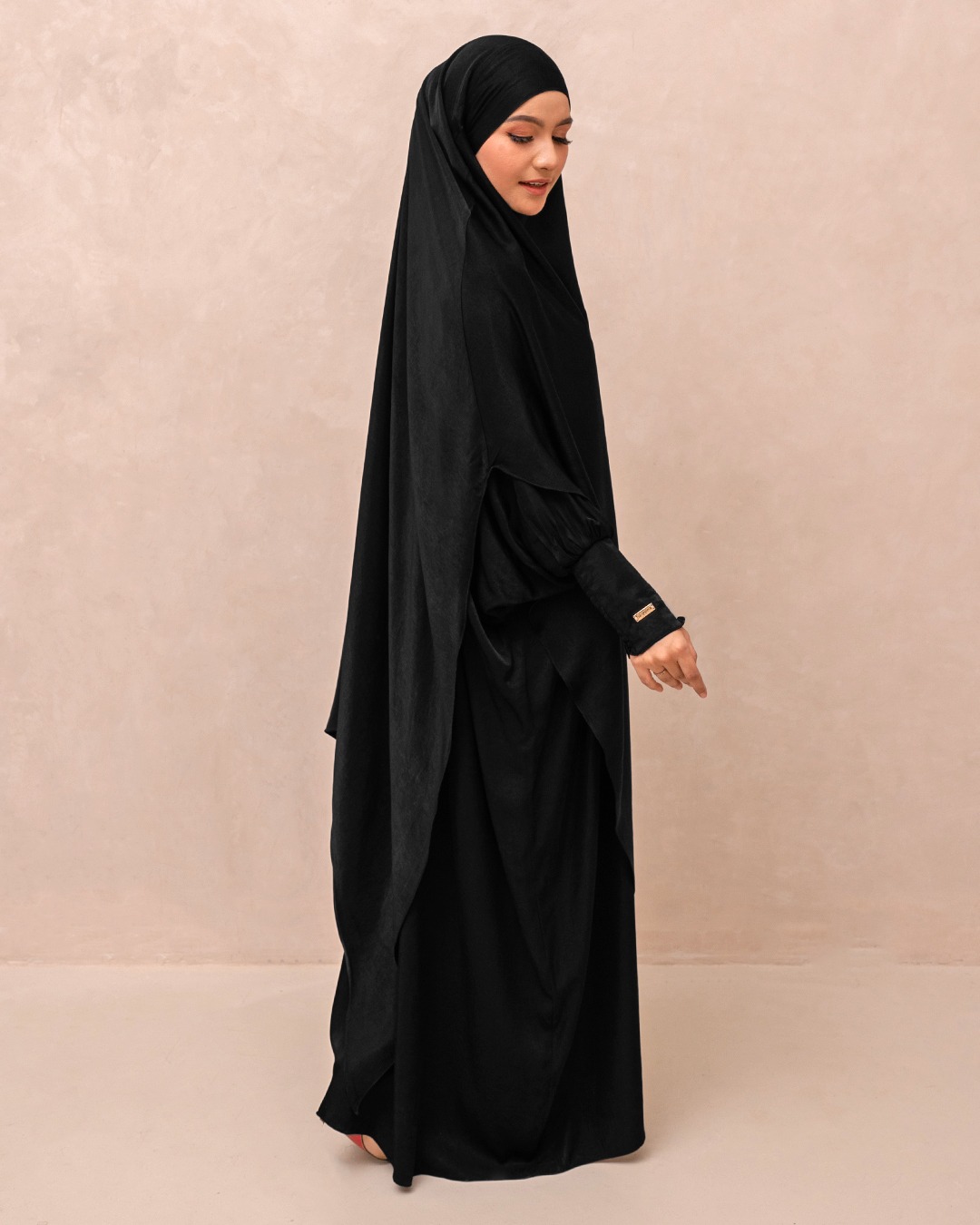 Gamis syar’i yang dihiasi detail lengan puff dan smock elastis di pergelangan. Dilengkapi bukaan resleting depan yang memudahkan saat berwudhu, menghadirkan tampilan anggun sekaligus praktis & fungsional.