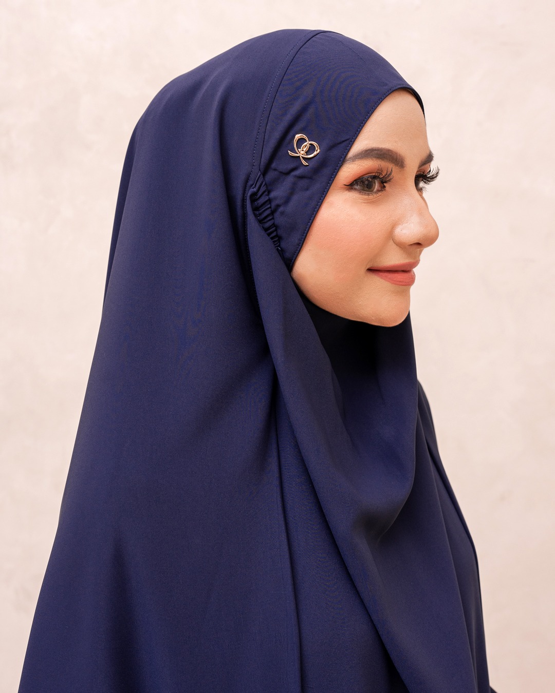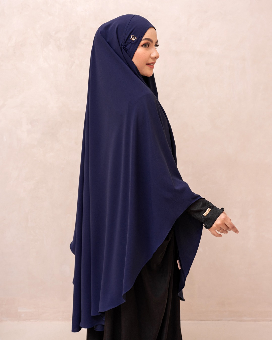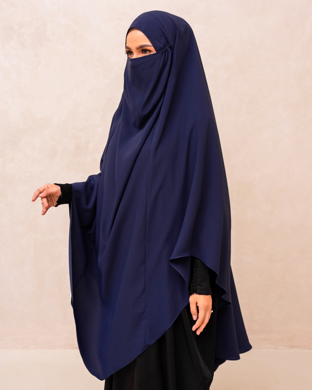 Khimar 3 gaya pemakaian dengan niqab lepas-pasang berelastik, memberikan kenyamanan ekstra sepanjang hari.