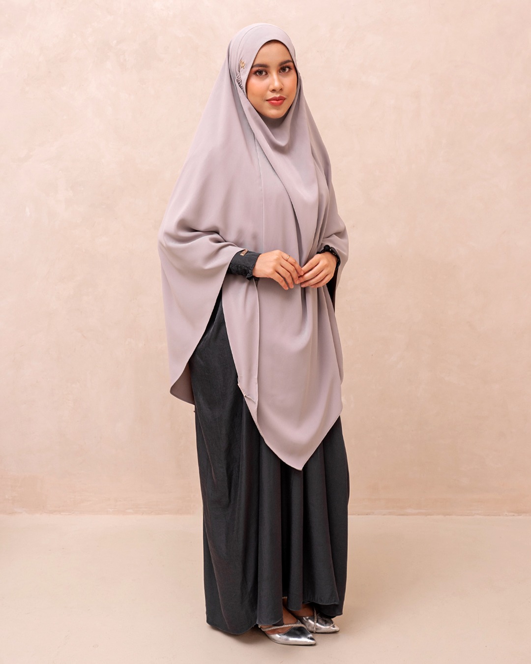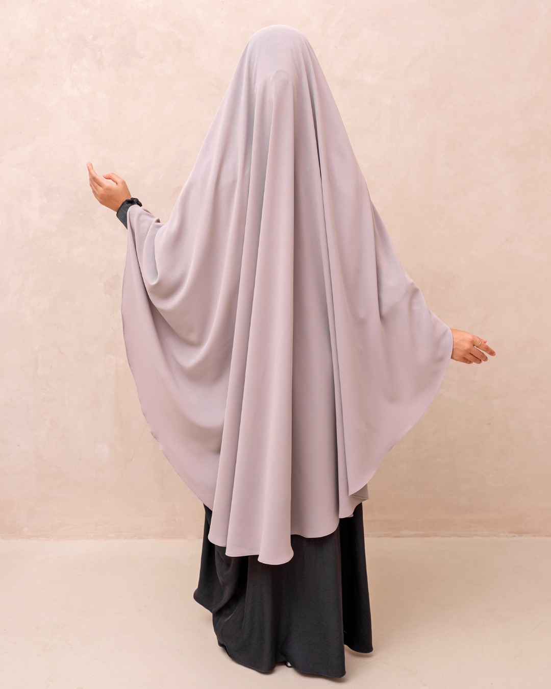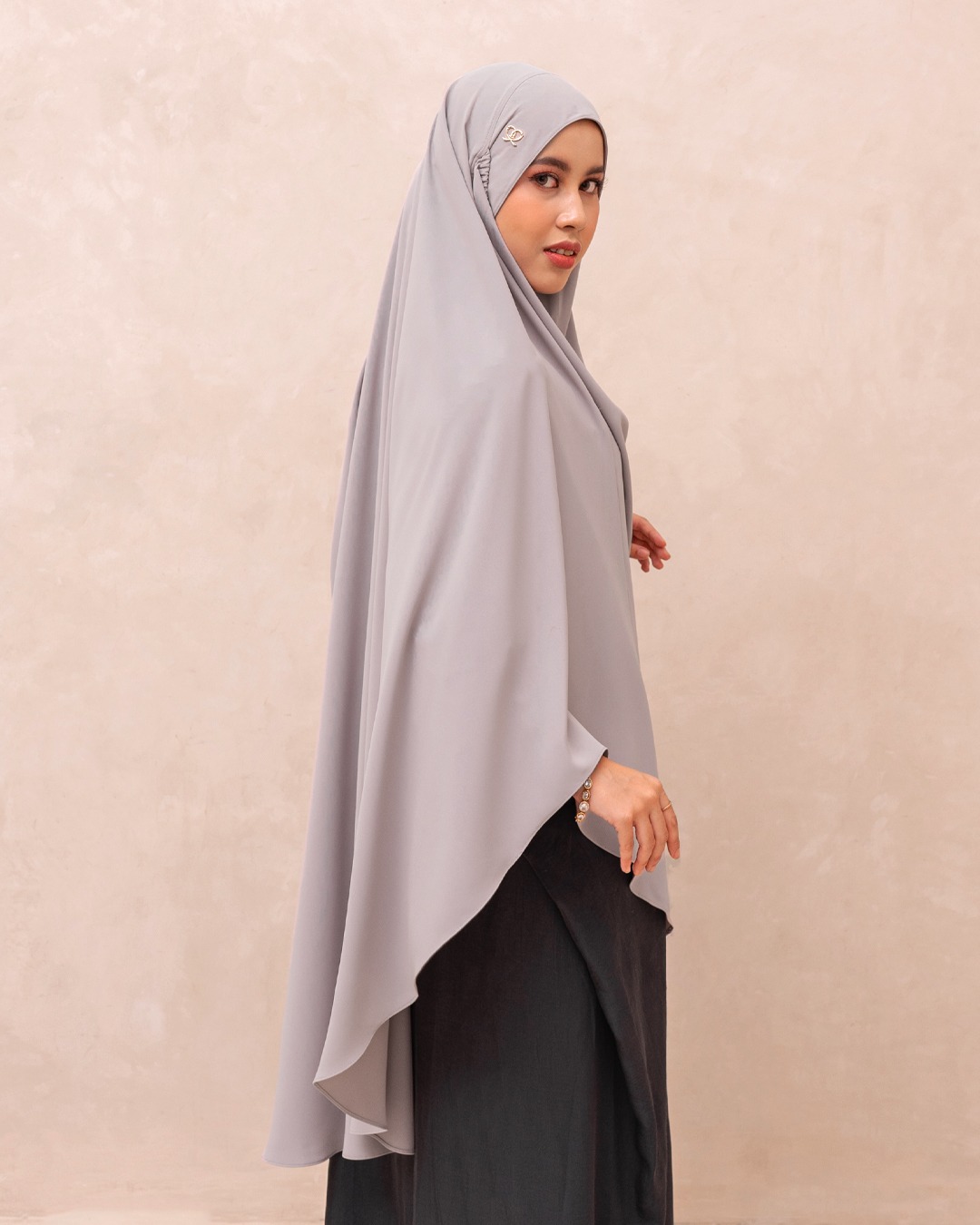 Khimar 3 gaya pemakaian dengan niqab lepas-pasang berelastik, memberikan kenyamanan ekstra sepanjang hari.