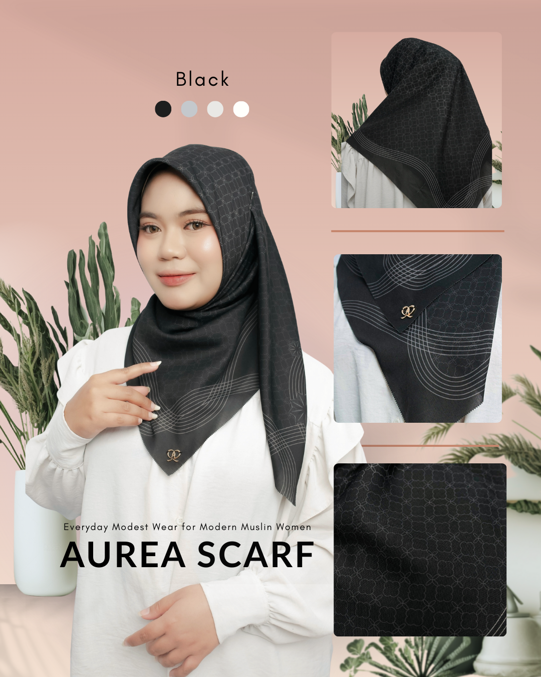 Aurea Scarf warna Black menghadirkan interpretasi modern dari scarf hitam klasik. Dipadukan dengan pattern monogram subtle dan aksen garis lengkung yang dinamis, desain ini menciptakan tampilan yang tegas namun tetap sophisticated.